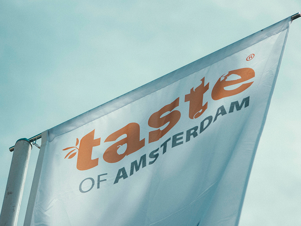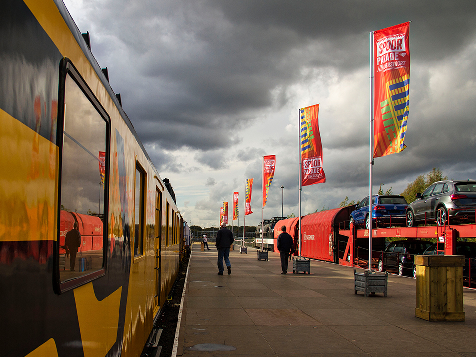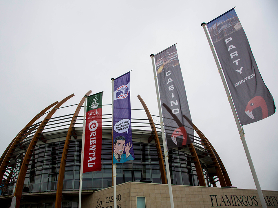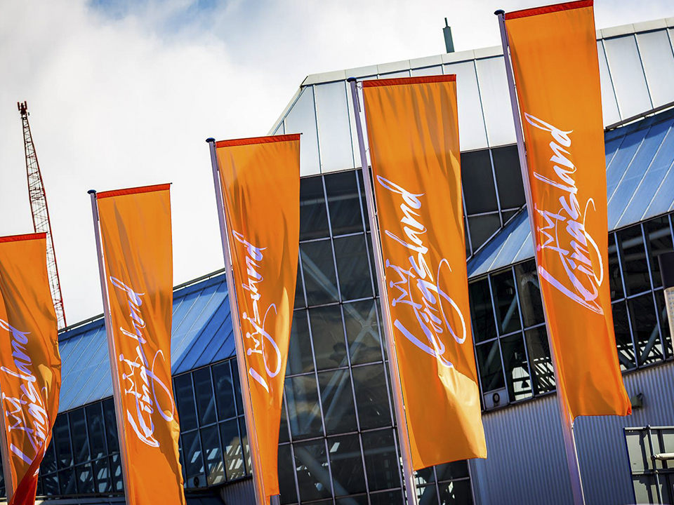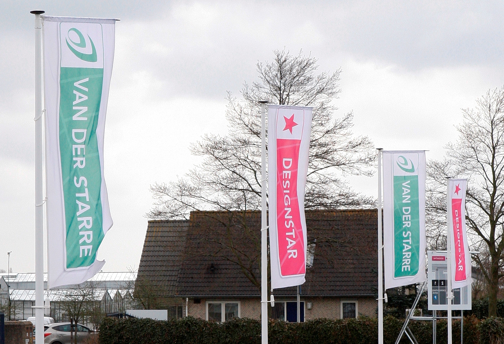 Door de uithouder is de verticale baniervlag altijd goed zichtbaar