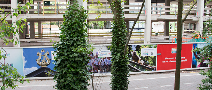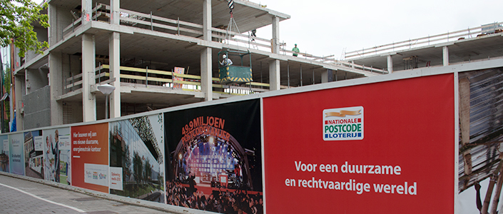 De Schepper Campagnes van de Goede Doelen Loterijen op de bouwschutting die twee jaar rond het pand staat een zeer milieuvriendelijke en volledig PVC en ftalaat vrije uiting aangebracht. Verder is de coating van het gebruikte materiaal op waterbasis en hebben wij het materiaal met onze zeer