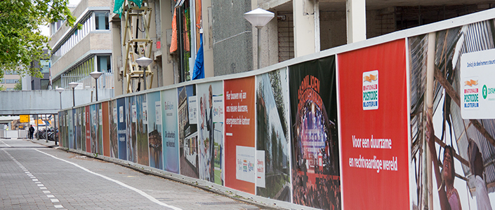 Omdat de Goede Doelen Loterijen tot in details het duurzaamheid principe wilde doorzetten, hebben wij ook bij de montage van de doeken op de bouwschutting alleen FSC gecertificeerd materiaal gebruikt.
