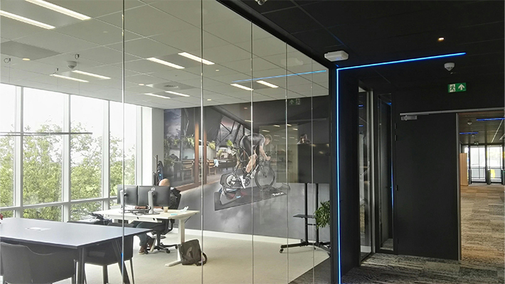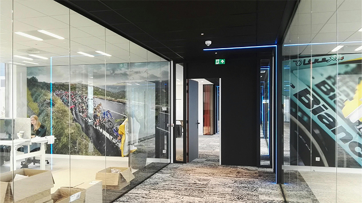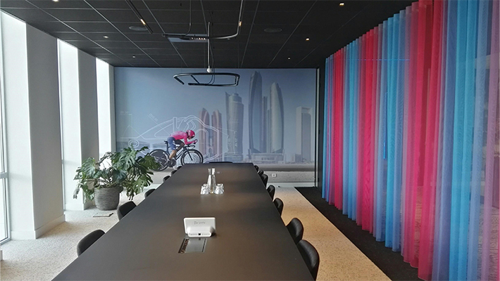 In de voorbereiding is er zeer veel tijd gestoken in een hoge kwaliteit van fotografie en beeldbewerking, die op ons gesublimeerde blackback doek al hun schitterende kleuren tonen. Het frame is door het exact inmeten van de muren vrijwel niet zichtbaar, waardoor de beelden in dit nagelnieuwe pand nog meer de aandacht opeisen. Daarbij is ook bij de inrichting rekening gehouden met de visuals die in de kantoren zijn geplaats, waardoor een prachtig geheel ontstaat, passend bij een multinational als Tacx/Garmin.